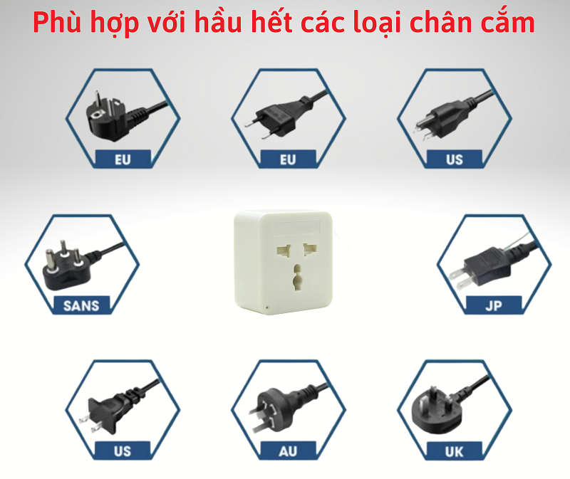 - Thiết kế nhỏ gọn vuông vắn, lỗ cắm chân tương thích với hầu hết các ổ cắm, nút nhấn bật/tắt ngay trên thiết bị vô cùng tiện lợi.